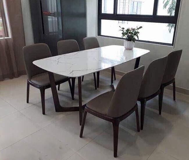 Bàn Ăn Mặt Đá 6 Ghế Mặt Đá Gỗ Tần Bì loại bỏ hoàn toàn phong cách truyền thống thường thấy của bàn ăn.